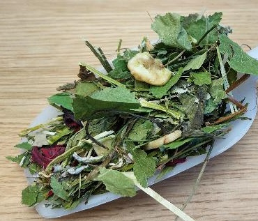 OverzichtSamenstelling: Peterseliesteeltjes, banaan, berkenblad, frambozenblad, paardenbloem, luzerne en hibiscus.